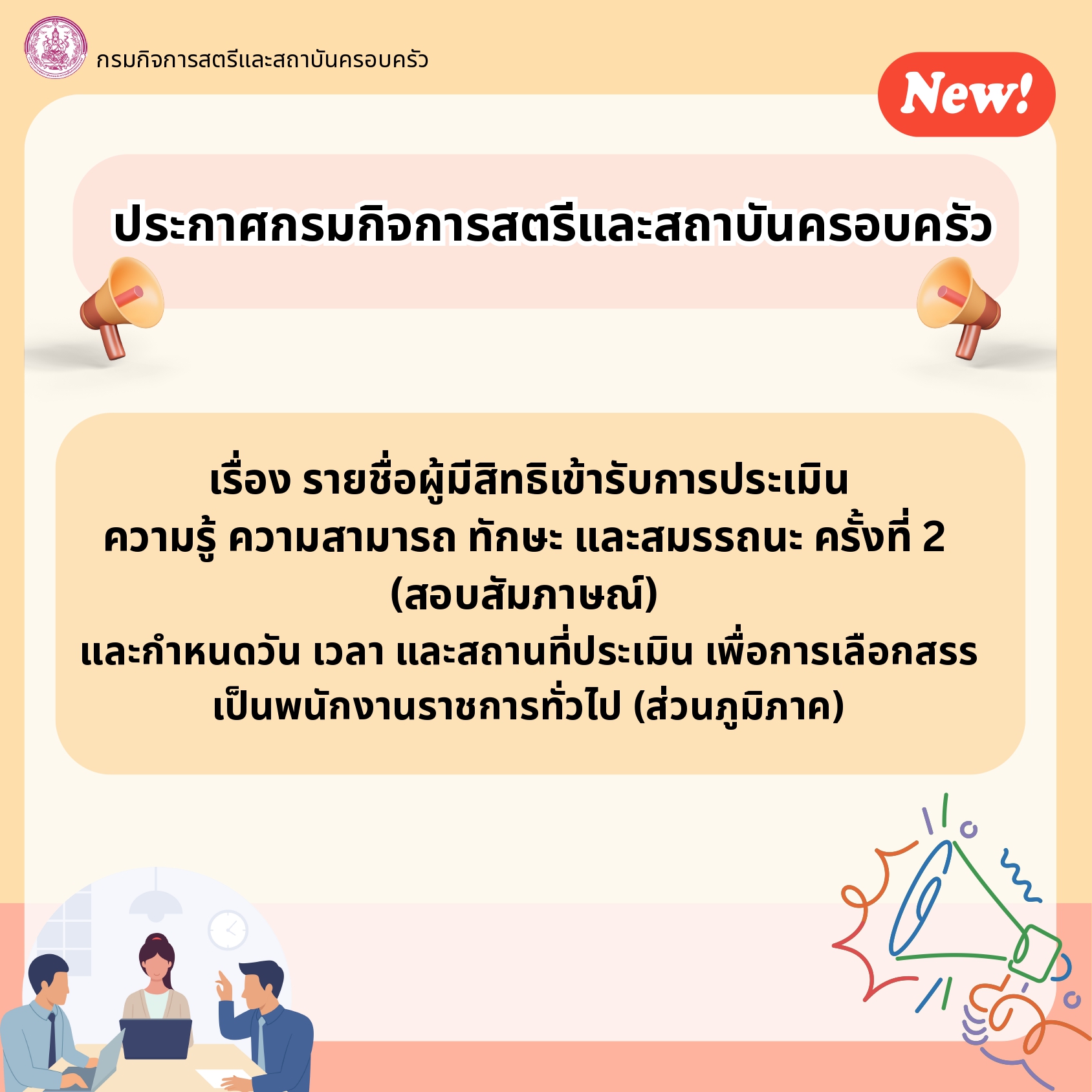 เรื่อง รายชื่อผู้มีสิทธิเข้ารับการประเมินความรู้ความสามารถ ทักษะ และสมรรถนะ ครั้งที่ 2 (สอบสัมภาษณ์) และกำหนดวัน เวลา และสถานที่ประเมิน เพื่อการเลือกสรรเป็นพนักงานราชการทั่วไป (ส่วนภูมิภาค)