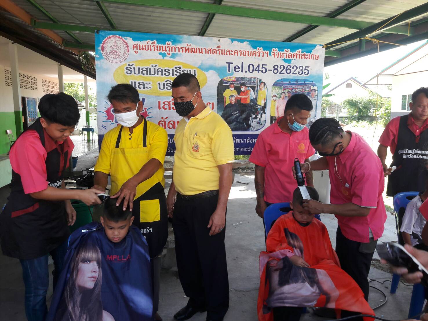วันที่ 14 กรกฎาคม 2563 ผู้อำนวยการศูนย์เรียนรู้การพัฒนาสตรีและครอบครัวภาคตะวันออกเฉียงเหนือ จังหวัดศรีสะเกษ (นางสาวจารุวรินทร์ ธนาชนะสิทธิ์) มอบหมายให้ครูแผนก พร้อมด้วยผู้เข้ารับการฝึกอาชีพแผนกตัดผมชาย ออกหน่วยฝึกภาคปฏิบัติ ณ โรงเรียนบ้านหมากเขียบ ตำบลหมากเขียบ อำเภอเมือง จังหวัดศรีสะเกษ มีผู้มารับบริการจำนวน 39 คน พร้อมทั้งประชาสัมพันธ์การฝึกอาชีพภายในศูนย์ฯ