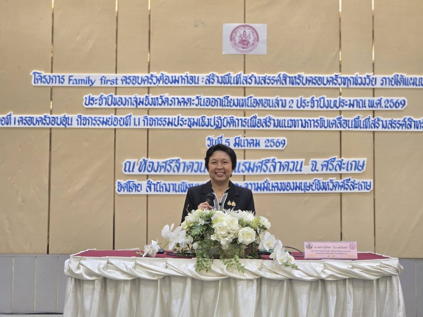 วันพฤหัสบดี ที่ 5 มีนาคม 2569 เวลา 08.30 น. นางสาวจุรีพร ภิบาลจันทร์ ผู้อำนวยการศูนย์เรียนรู้การพัฒนาสตรีและครอบครัวภาคตะวันออกเฉียงเหนือ จังหวัดศรีสะเกษ ร่วมเป็นวิทยากรให้ความรู้ในโครงการ Family First ครอบครัวต้องมาก่อน : เสริมสร้างครอบครัวเข้มแข็ง พอเพียง และยั่งยืน ภายใต้แผนปฏิบัติราชการประจำปีของกลุ่มจังหวัดภาคตะวันออกเฉียงเหนือตอนล่าง 2 ประจำปีงบประมาณ พ.ศ. 2569 กิจกรรมย่อยที่ 1 กิจกรรมครอบครัวอบอุ่น กิจกรรมย่อยที่ 1.1 การประชุมเชิงปฏิบัติการเพื่อสร้างแนวทางการขับเคลื่อนพื้นที่สร้างสรรค์สำหรับครอบครัวทุกช่วงวัยในชุมชน โดยมี นางสาววีรินท์ นิตย์สุวรรณ พัฒนาสังคมและความมั่นคงของมนุษย์จังหวัดศรีสะเกษ เป็นประธานในการเปิดประชุมฯ ณ โรงแรมศรีลำดวน อำเภอเมืองศรีสะเกษ จังหวัดศรีสะเกษ