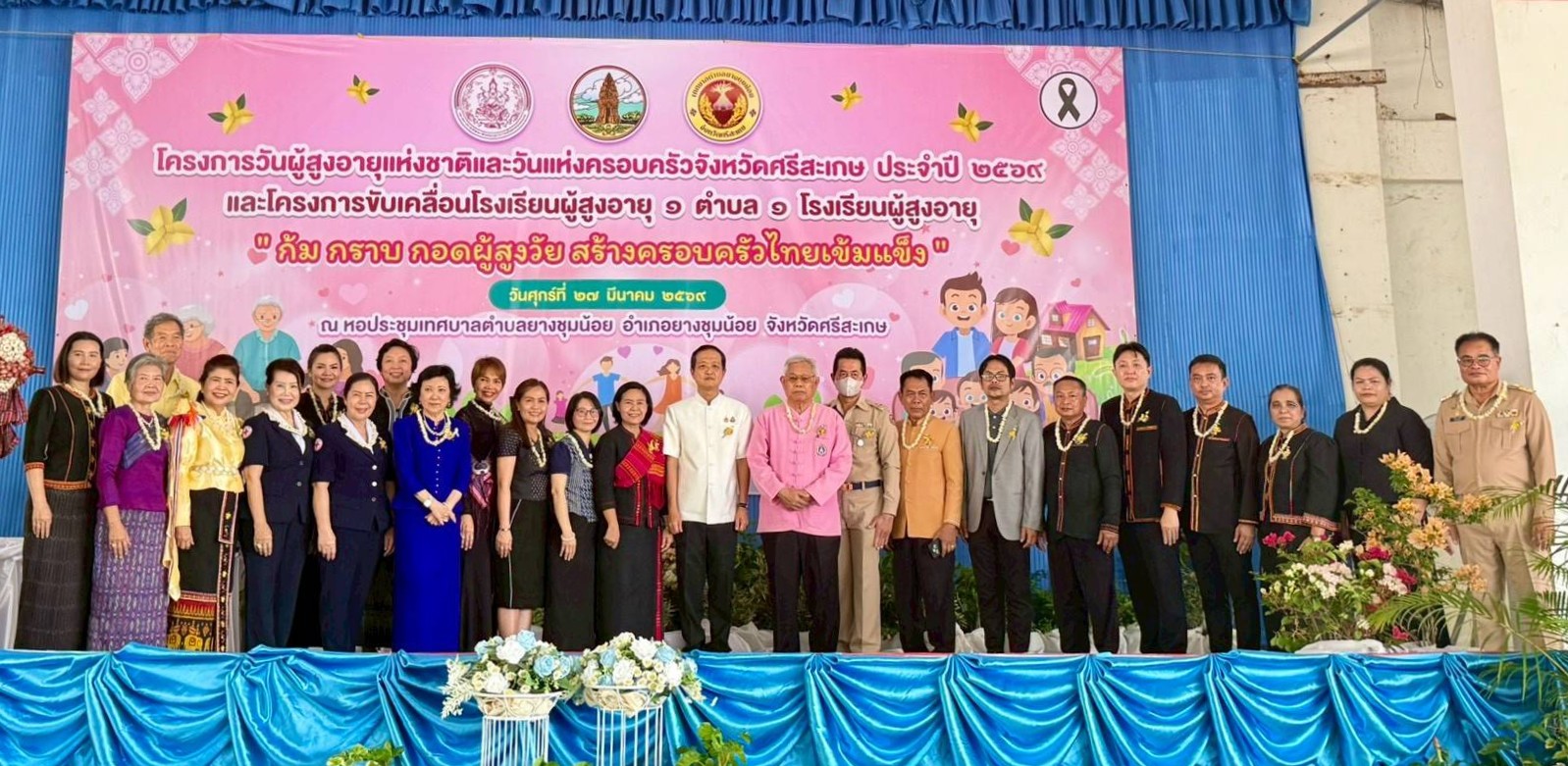 วันศุกร์ ที่ 27 มีนาคม 2569 เวลา 11.00 น. นางสาวจุรีพร ภิบาลจันทร์ ผู้อำนวยการศูนย์เรียนรู้การพัฒนาสตรีและครอบครัวภาคตะวันออกเฉียงเหนือ จังหวัดศรีสะเกษ ร่วมงานวันผู้สูงอายุแห่งชาติ และวันแห่งครอบครัวจังหวัดศรีสะเกษ ประจำปี 2569 และโครงการขับเคลื่อนโรงเรียนผู้สูงอายุ 1 ตำบล 1 โรงเรียนผู้สูงอายุ เพื่อเป็นการส่งเสริม และสนับสนุนให้เกิดกิจกรรมวัฒนธรรมและประเพณี ที่เป็นประโยชน์ร่วมกันระห่างผู้สูงอายุ เด็ก เยาวชน ครอบครัว คนทุกวัย และเครือข่ายที่เกี่ยวข้องโดยมี นายอนุรัตน์ ธรรมประจำจิต ผู้ว่าราชการจังหวัดศรีสะเกษ เป็นประธานในพิธีฯ ณ หอประชุมเทศบาลตำบลยางชุมน้อย อำเภอยางชุมน้อย จังหวัดศรีสะเกษ